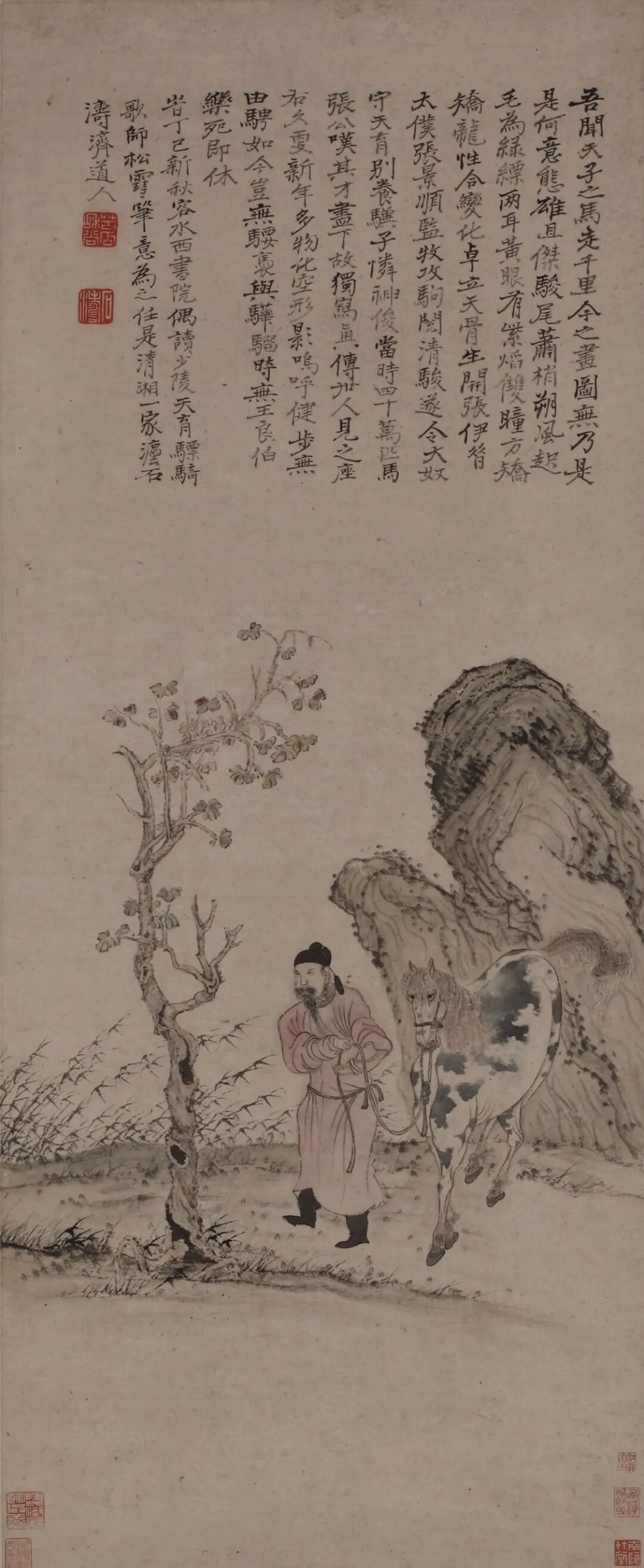 该画是石涛早年少见的人物画作,也是石涛仅有的画马之作。画中描绘了一个戴有唐巾、牵一匹玉花骢的男子,背景以山树衬托,整体给人以明净雅洁、意境深邃之感。据专家考证,这幅画是石涛为当时的泾县县令邓伟男所作,以伯乐和千里马的典故,歌颂邓伟男修建水西书院、招揽四方才俊的功绩。画面上方题“天育骠骑歌(唐•杜甫)”, 与图像相映成趣,尽显石涛笔墨之精妙与文人雅趣。2009年,此画被选为《石涛作品选》特种邮票中的一枚,得以更广泛地传播。