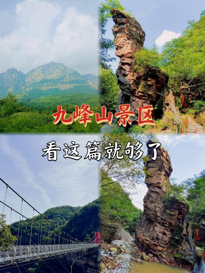 以九座奇峰得名的九峰山,原始森林覆盖率高达90%,是省级森林公园。景区内有玻璃吊桥、高空旱滑、水滑等丰富的游乐设施,还有梦幻光影灯光秀、水幕电影等夜场活动。四季风景各异,夏季凉爽、冬季有冰挂,是亲近自然、放松身心的好地方。