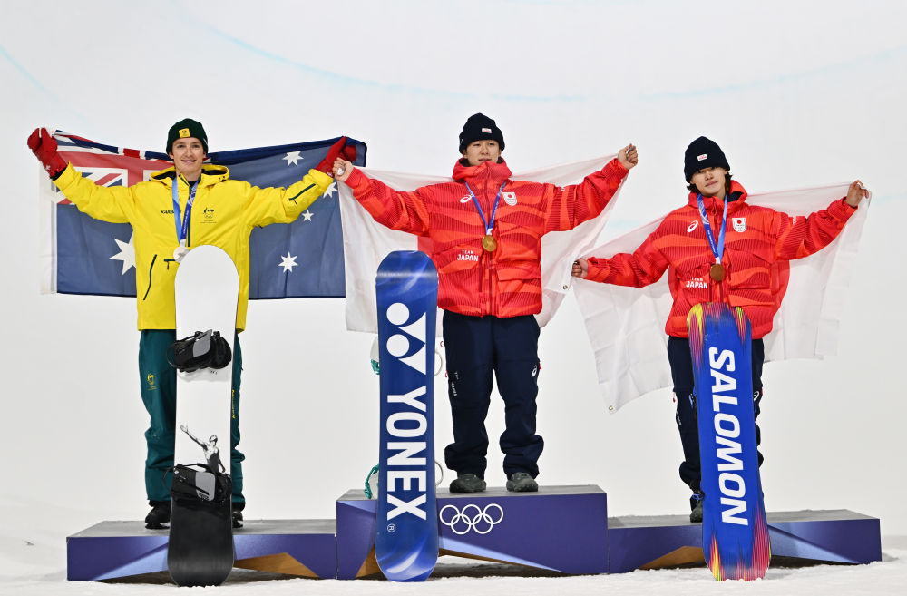 2月13日,冠军日本选手户塚优斗(中)、亚军澳大利亚选手斯科蒂·詹姆斯(左)和季军日本选手山田琉圣在颁奖仪式上。新华社记者 张宏祥 摄