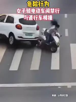 危险行为!女子骑电动车闯禁行与直行车相撞。
