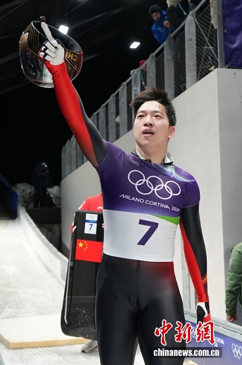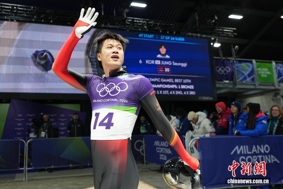 当地时间2月13日晚,2026年米兰-科尔蒂纳冬奥会男子钢架雪车比赛在科尔蒂纳滑行中心继续进行。中国队选手陈文浩最终以总成绩3分44秒59名列第4,以0.19秒之差与奖牌擦身而过。图为陈文浩在赛后向观众致意。