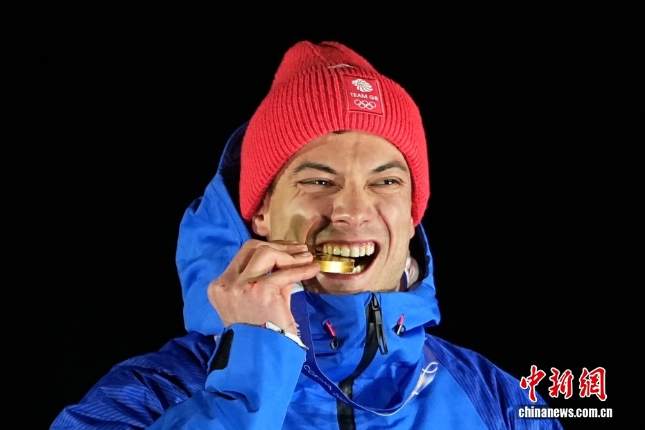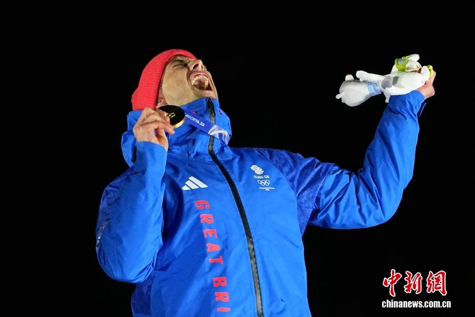 当地时间2月13日晚,2026年米兰-科尔蒂纳冬奥会男子钢架雪车比赛在科尔蒂纳滑行中心继续进行。英国选手马特·韦斯顿延续统治,在该项目四轮滑行中四次刷新赛道纪录,最终以总成绩3分43秒33夺冠。图为马特·韦斯顿在颁奖仪式上“品尝”金牌。