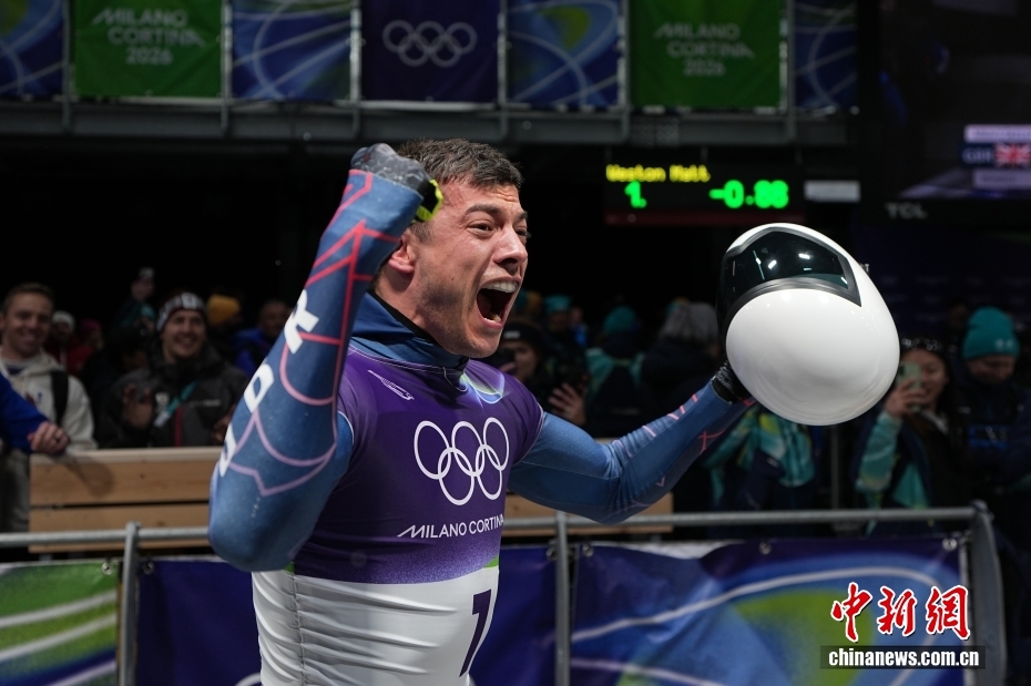 当地时间2月13日晚,2026年米兰-科尔蒂纳冬奥会男子钢架雪车比赛在科尔蒂纳滑行中心继续进行。英国选手马特·韦斯顿延续统治,在该项目四轮滑行中四次刷新赛道纪录,最终以总成绩3分43秒33夺冠。图为马特·韦斯顿在赛后激动庆祝夺冠。