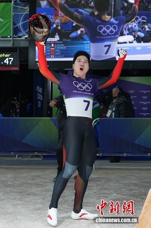 当地时间2月13日晚,2026年米兰-科尔蒂纳冬奥会男子钢架雪车比赛在科尔蒂纳滑行中心继续进行。中国队选手陈文浩最终以总成绩3分44秒59名列第4,以0.19秒之差与奖牌擦身而过。图为陈文浩在赛后庆祝完赛。