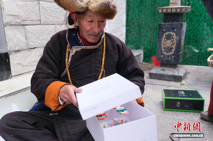 2月13日,拉萨年货市场,来自日喀则市仁布县的酥油花手工艺人加布正在打包刚卖出去的酥油花。中新社记者 江飞波 摄