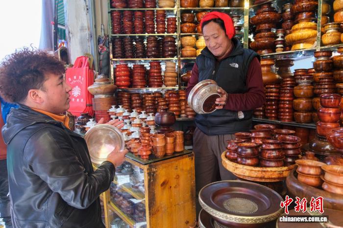 2月13日,拉萨年货市场,来自昌都市芒康县的康巴汉子阿旺次仁(右)为顾客挑选藏式木碗。中新社记者 江飞波 摄