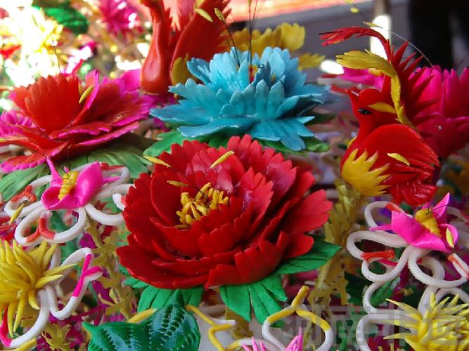 卢氏面塑的独特,在于其兼容南北的气质。艺人李文增创新的“豫西新面塑”,将传统纹样与现代题材融合,关公像威严庄重,卡通人物活泼俏皮,皆能长久保存。 婚庆面塑则以龙凤牡丹寄寓吉祥,丧仪面塑用“奠”字传递哀思,日常面塑更以果蔬花卉点缀生活。 这些面团经发酵、塑形、蒸制、彩绘五道工序,最终定格为色彩艳丽、造型精巧的艺术品,体积虽小,却能跨越山河,成为游子心中的乡愁符号。
