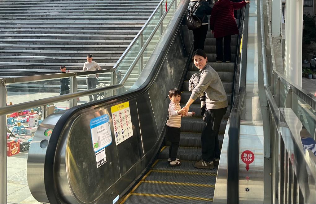 2月12日,刘梁慧和女儿乘坐神女大扶梯。新华社记者周文冲 摄