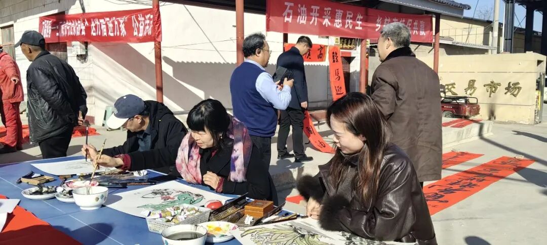 在东沟村活动现场,书画艺术家们被石油工人和群众的热情所包围。他们根据大家挑选饱含祝福的联语,则真草隶行等字体,各展所长,将一句句吉祥话、一声声祝福语化作一幅幅大红春联。美术家们则以山水花鸟为题材,即兴创作国画,水墨丹青间,为新春增添了柔美的气息。