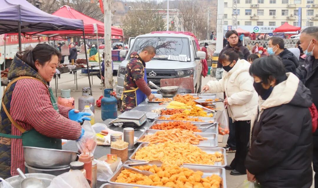 小吃区热气氤氲,是集市最具人气的板块。刚出炉的肉夹馍外皮酥脆、肉香醇厚,现炸鸡块、手工鸡蛋糕、现炒瓜子花生香气弥漫,食客往来不绝。“大集人气旺,一天能卖300多个肉夹馍,比平时多三成。”小吃摊主王师傅笑着说,固定开集让生意更稳定,也让乡里乡亲的年味更足。