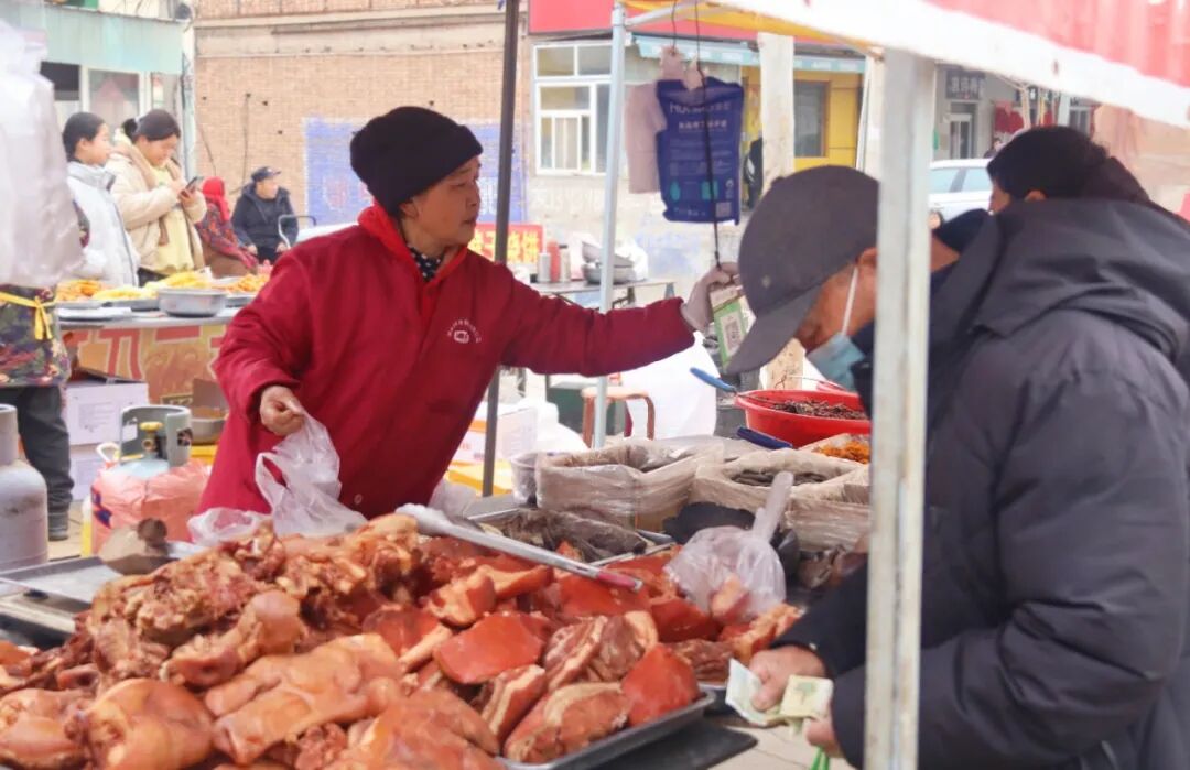 肉类区摊位前人头攒动,猪肉、牛肉、羊肉分类码放,猪头肉、酱肘子卤香扑鼻。摊主麻利切割、称重、打包,动作娴熟。“过年家家户户都要备肉,今天销量比平日翻番,单日销售额近万元。”肉类摊主李先生介绍,乡里提前统筹货源与价格,保障年货供应充足、价稳质优。