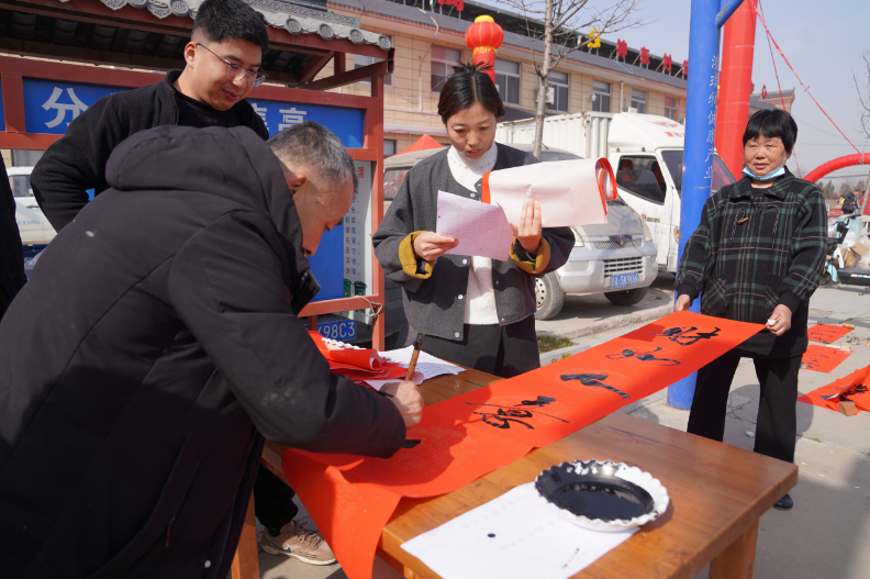 “拿着领取的票,大肉每斤5元,莲菜每斤一元。韭菜、油糕、春联都免费送。”村民刘聪明凭票买到了猪肉、莲菜,并领到了免费的韭菜和一副写着“家有福星四面照,财如人意八方来”的春联。现场,刘聪明笑得合不拢嘴:“两个孩子都在外地上班,村里想得周到,年货都给我们备上了,自己只花了几十元。”