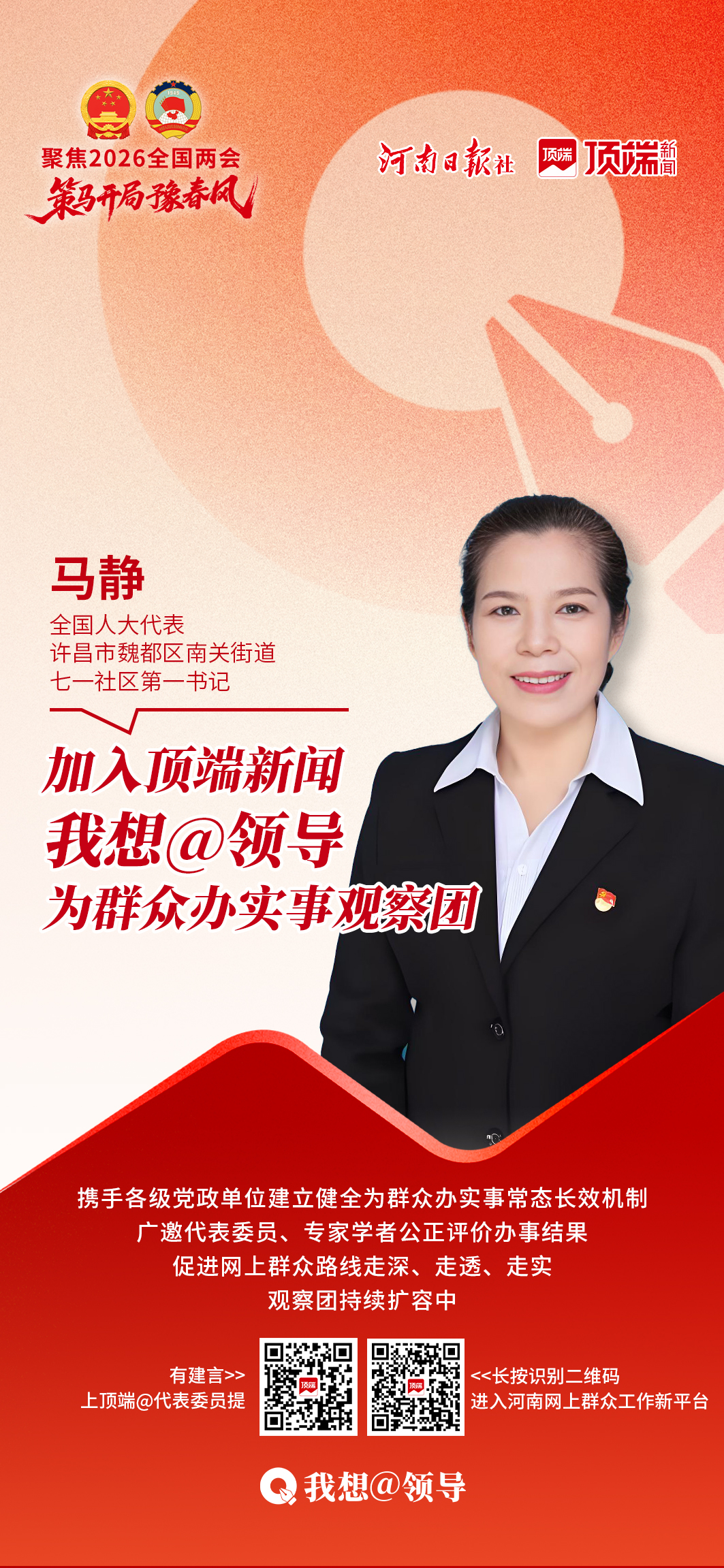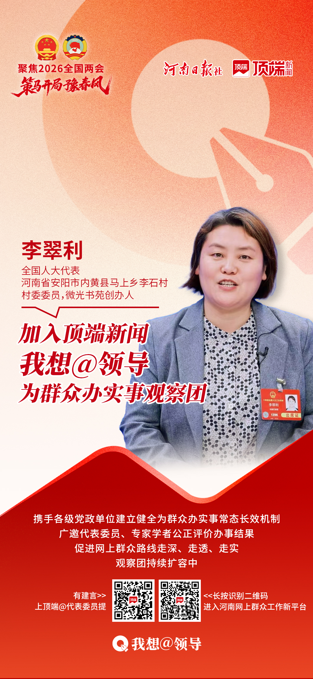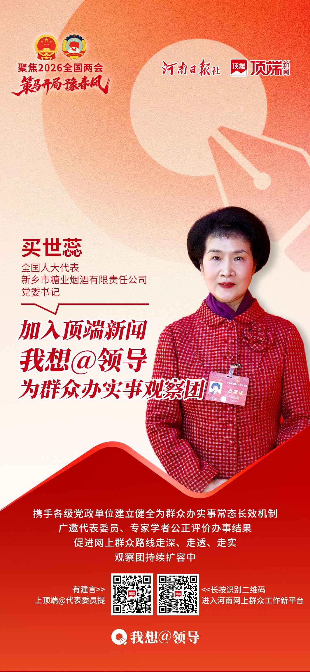 2026全国两会前夕,河南日报社顶端新闻“我想@领导”网上群众工作平台,开通“我想@代表委员”建言通道,诚邀广大群众建言献策,把心中的期盼、民生的诉求传递给代表委员。3月3日,买世蕊、金不换、李海燕、陈国厂、李灵、马静、曹兰英、李翠利、李学武、祁兴磊、汪荣秀等11位全国人大代表重磅入驻观察团,倾听群众心声、接收群众建言,这既是观察团力量的再强化、履职效能的再提升,更是全过程人民民主在基层的生动实践。