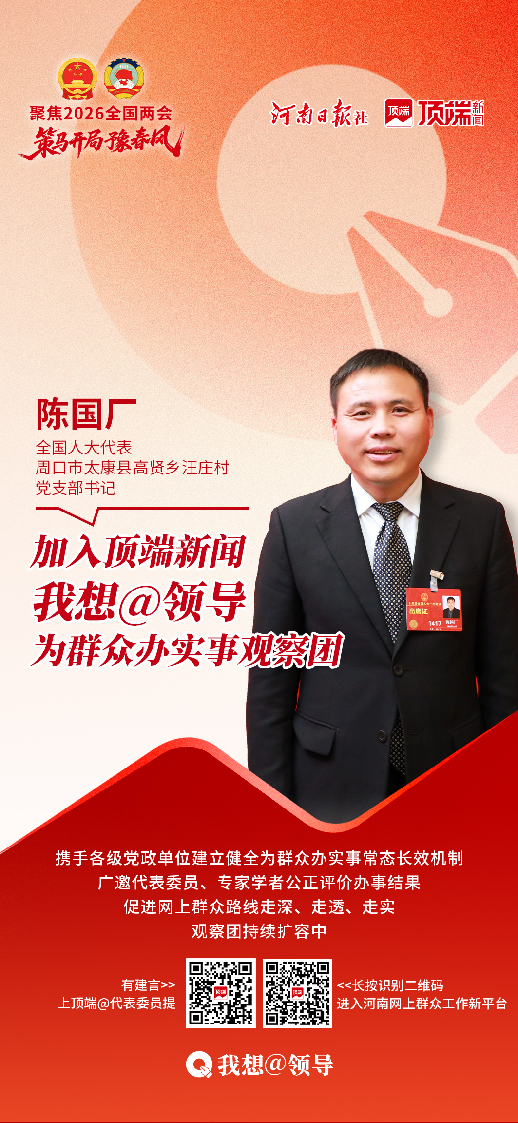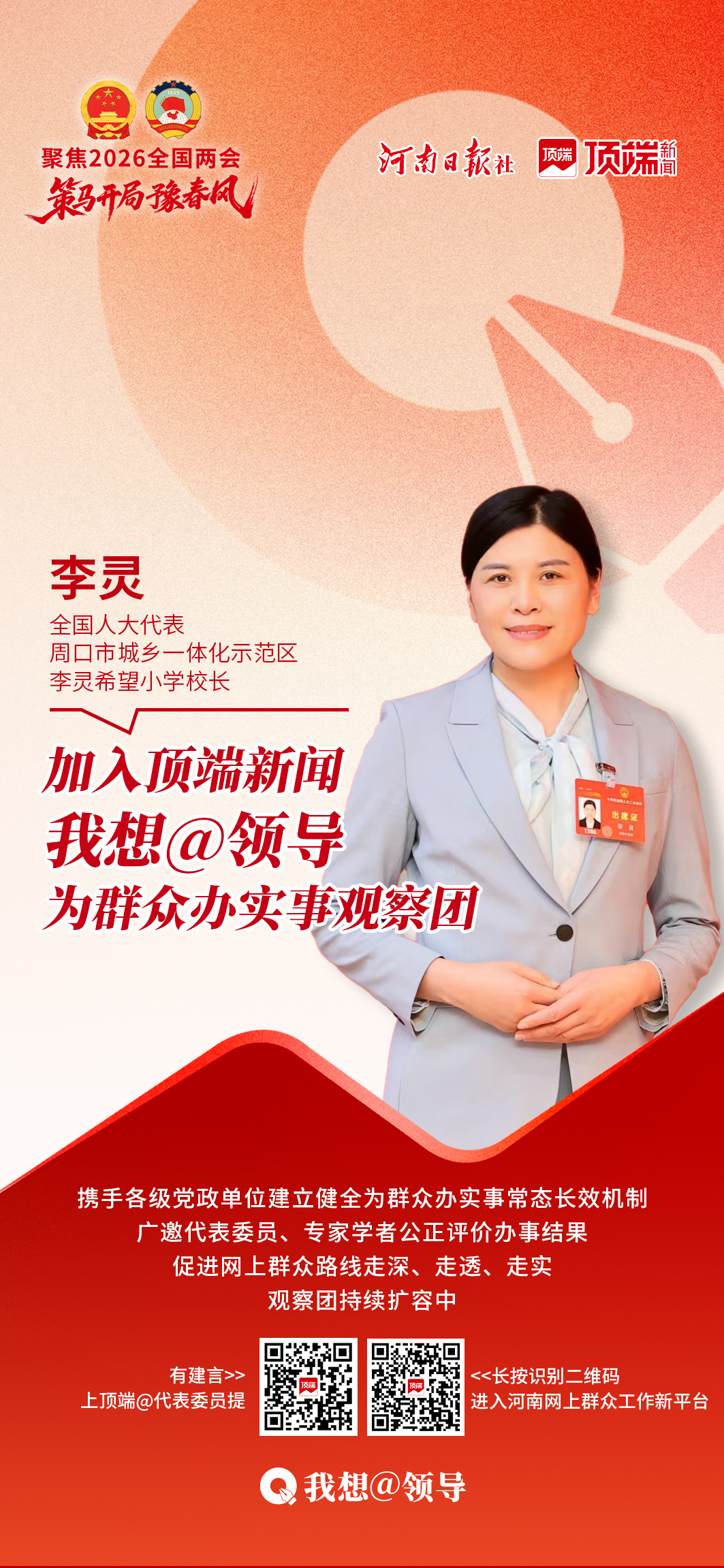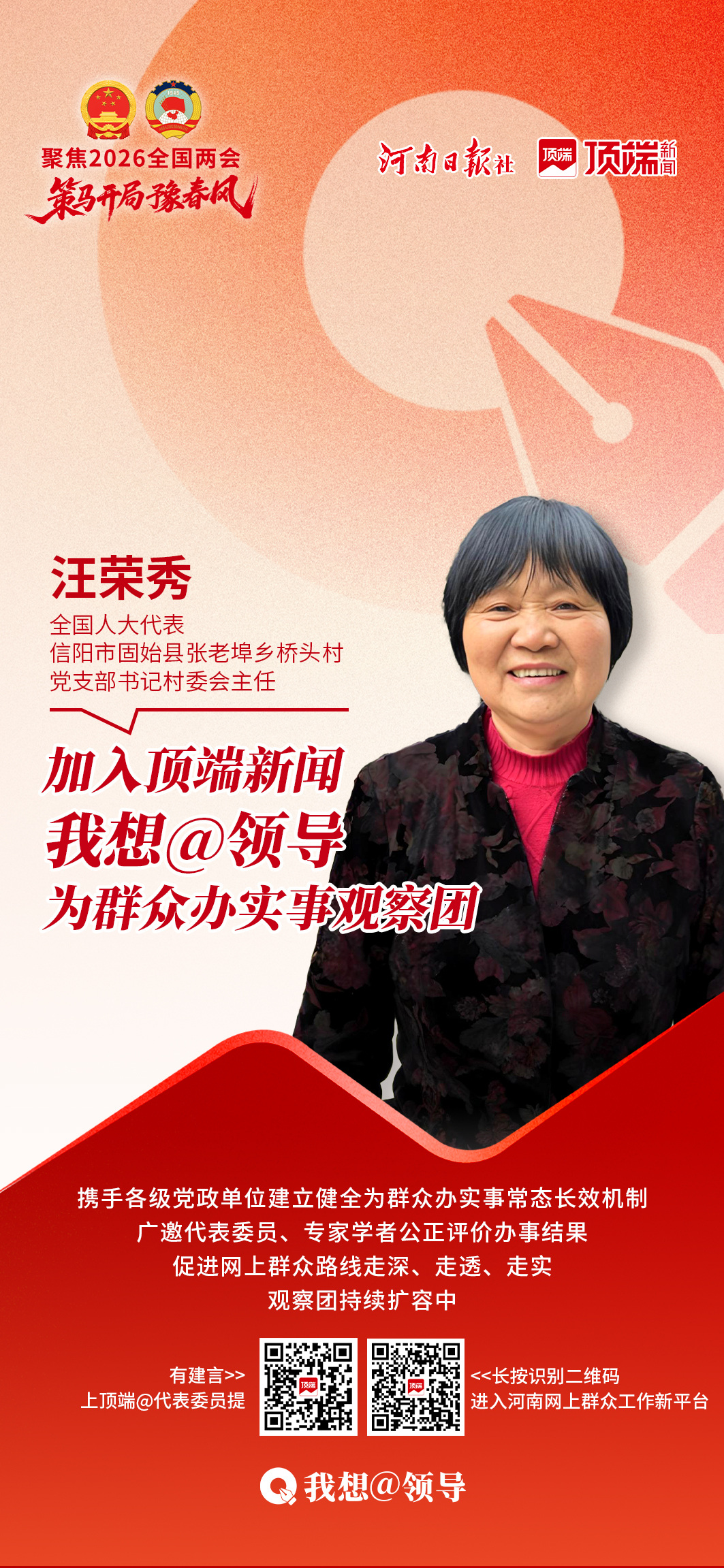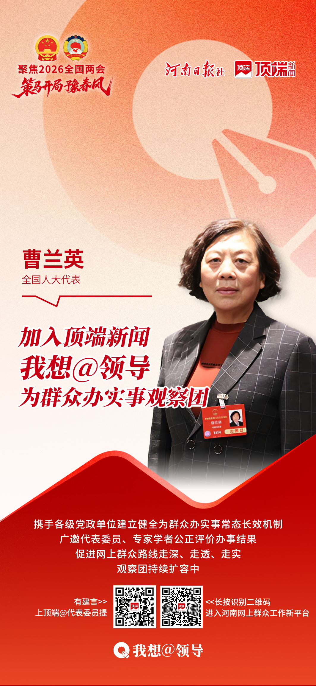 2026全国两会前夕,河南日报社顶端新闻“我想@领导”网上群众工作平台,开通“我想@代表委员”建言通道,诚邀广大群众建言献策,把心中的期盼、民生的诉求传递给代表委员。3月3日,买世蕊、金不换、李海燕、陈国厂、李灵、马静、曹兰英、李翠利、李学武、祁兴磊、汪荣秀等11位全国人大代表重磅入驻观察团,倾听群众心声、接收群众建言,这既是观察团力量的再强化、履职效能的再提升,更是全过程人民民主在基层的生动实践。