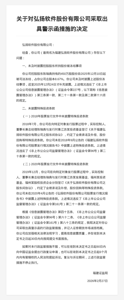 上述情况违反了《非上市公众公司监督管理办法》的相关规定。福建证监局决定对福建福特科光电股份有限公司采取出具警示函的行政监管措施,并记入证券期货市场诚信档案。