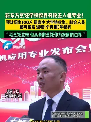 3月2日 河南郑州 新东方烹饪学校跨界开设无人机专业!预计招生100人,初高中,大学毕业生、社会人员都可报名。课程1个月到3年都有。“以烹饪立校,但从未将烹饪作为发展的边界”