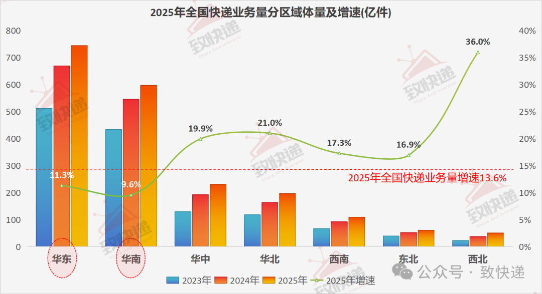 从结果来看,2025年全国快递业务量1989.5亿件、同比增长13.6%,快递收入1.5万亿元、同比增长6.5%,单价7.51元、同比下降6.3%,增速放缓,尤其华东和华南核心产粮区增长乏力。