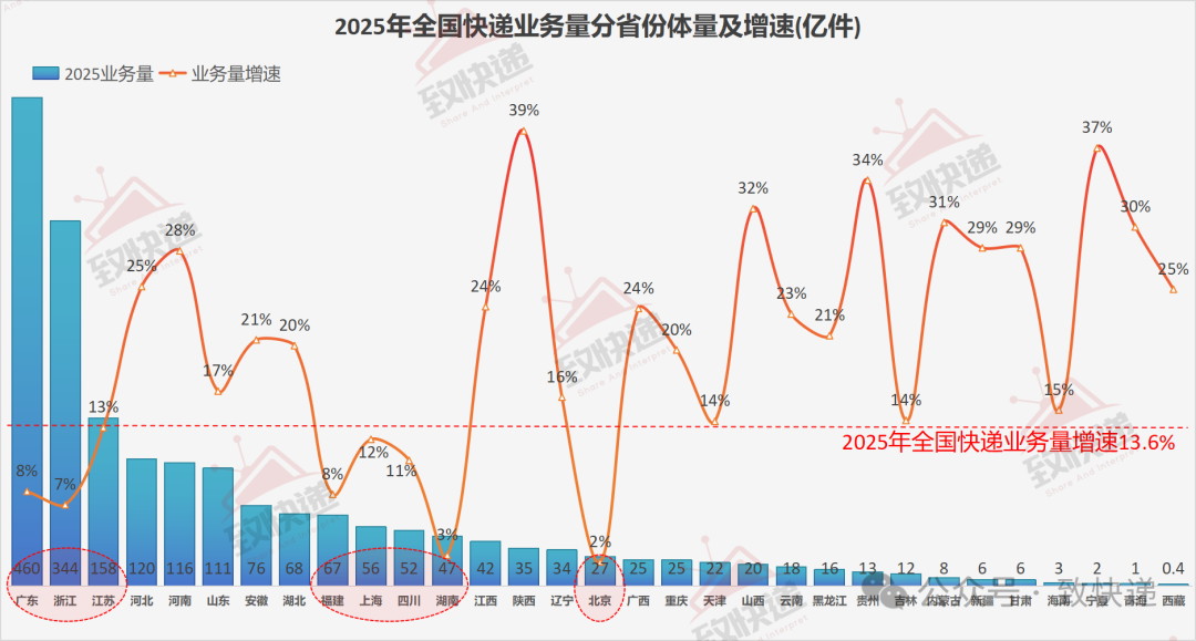 若把2025年快递业务量体量及增速分省份来看,也不难发现广东、浙江、江苏、福建、上海等省份的增速跌至个位数,而县域较多的陕西、宁夏、贵州、山西、内蒙古、青海等偏远省份保持30%以上的增速。