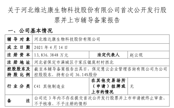 瑞财经 严明会 近日,河北维达康生物科技股份有限公司(以下简称:维达康)在河北证监局完成IPO辅导备案,辅导机构中信建投证券。