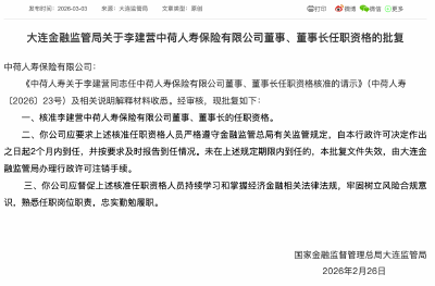 瑞财经 王敏 3月3日,大连金融监管局发布批复,核准李建营中荷人寿保险有限公司(以下简称“中荷人寿”)董事、董事长的任职资格。