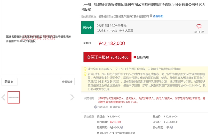 近日,京东资产交易平台显示,福建省信通投资集团股份有限公司(下称“信通集团”)持有的福建华通银行6650万股股权在该平台公开拍卖。