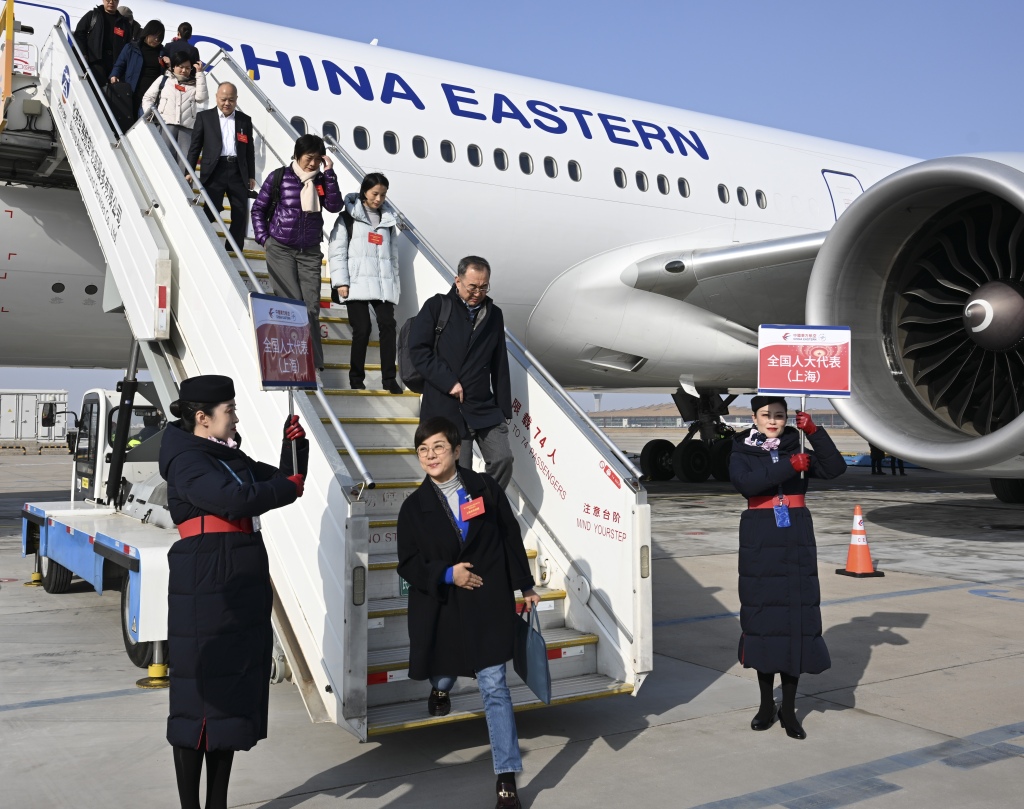 3月3日,参加十四届全国人大四次会议的在沪全国人大代表乘机抵京。张驰 摄